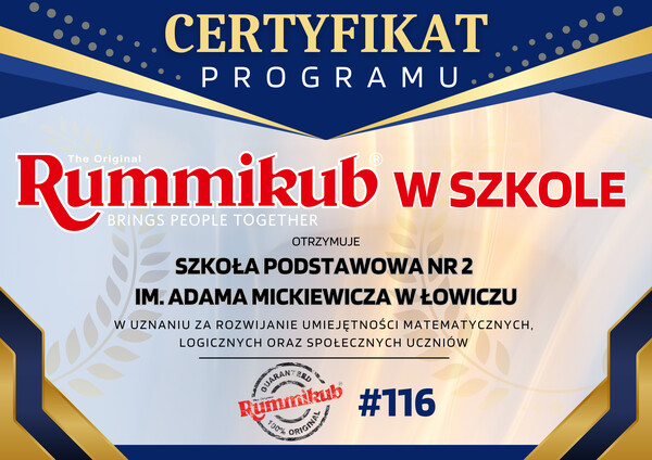 Szkoła Podstawowa Nr 2 im. Adama Mickiewicza w Łowiczu otrzymała certyfikat programu Rummikub w Szkole