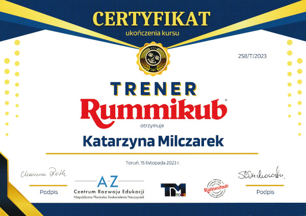 15 listopada 2023 r., podczas profesjonalnego szkolenia, uzyskałam certyfikat Trenera Rummikub, który dał mi możliwość organizowania różnego rodzajów turniejów: szkolnych i pozaszkolnych, z awansem oraz tzw. „luźne granie”.